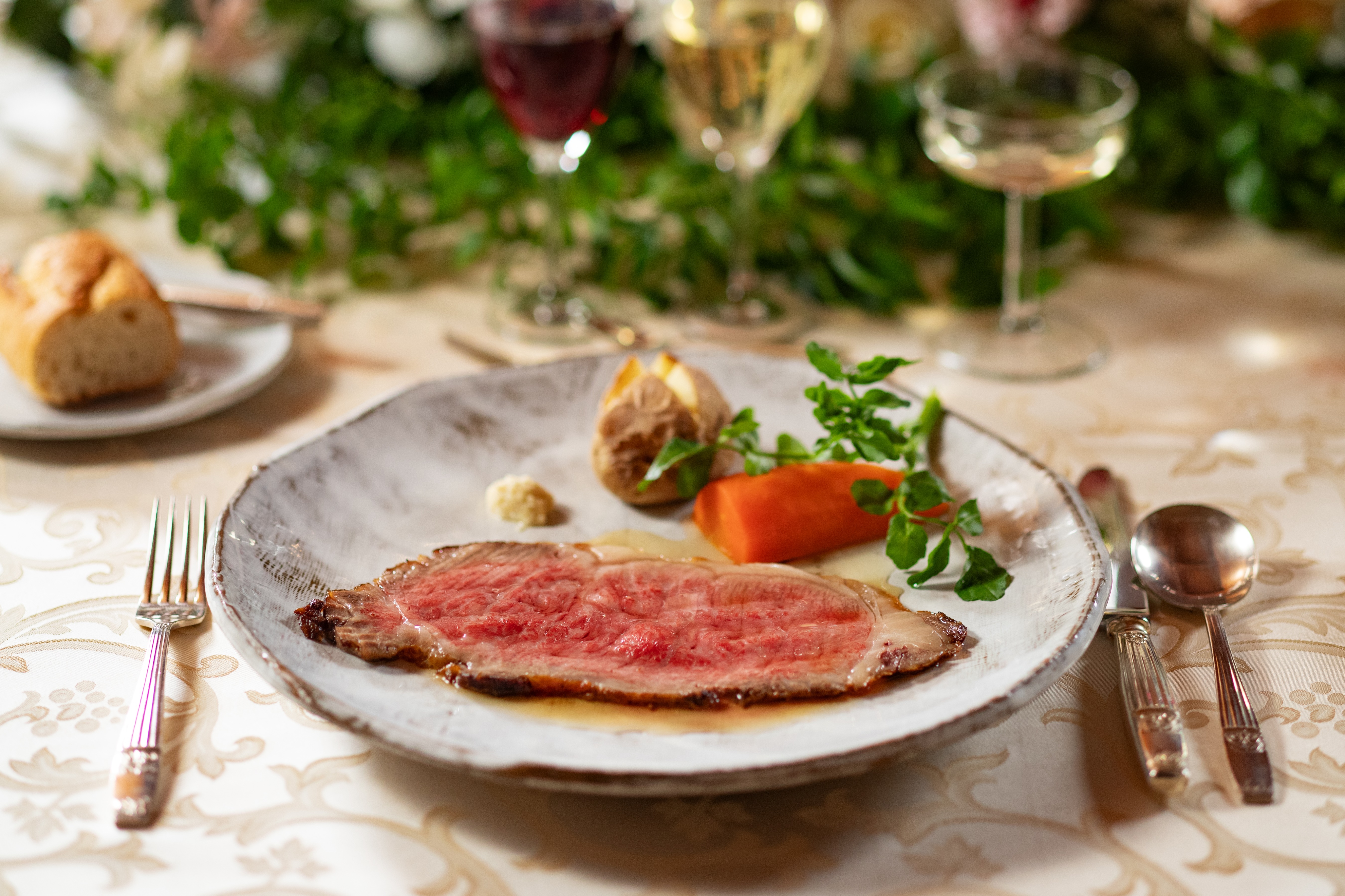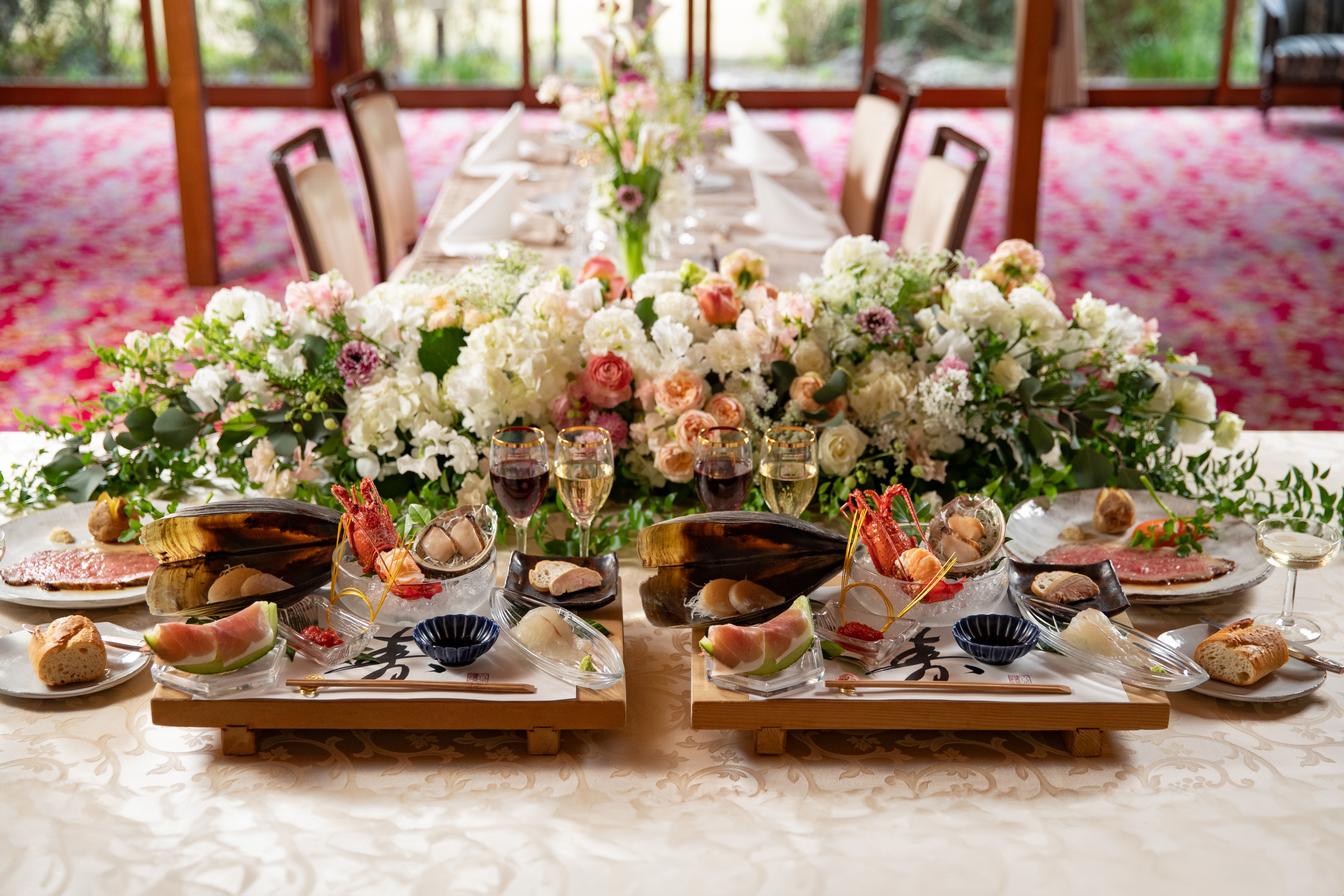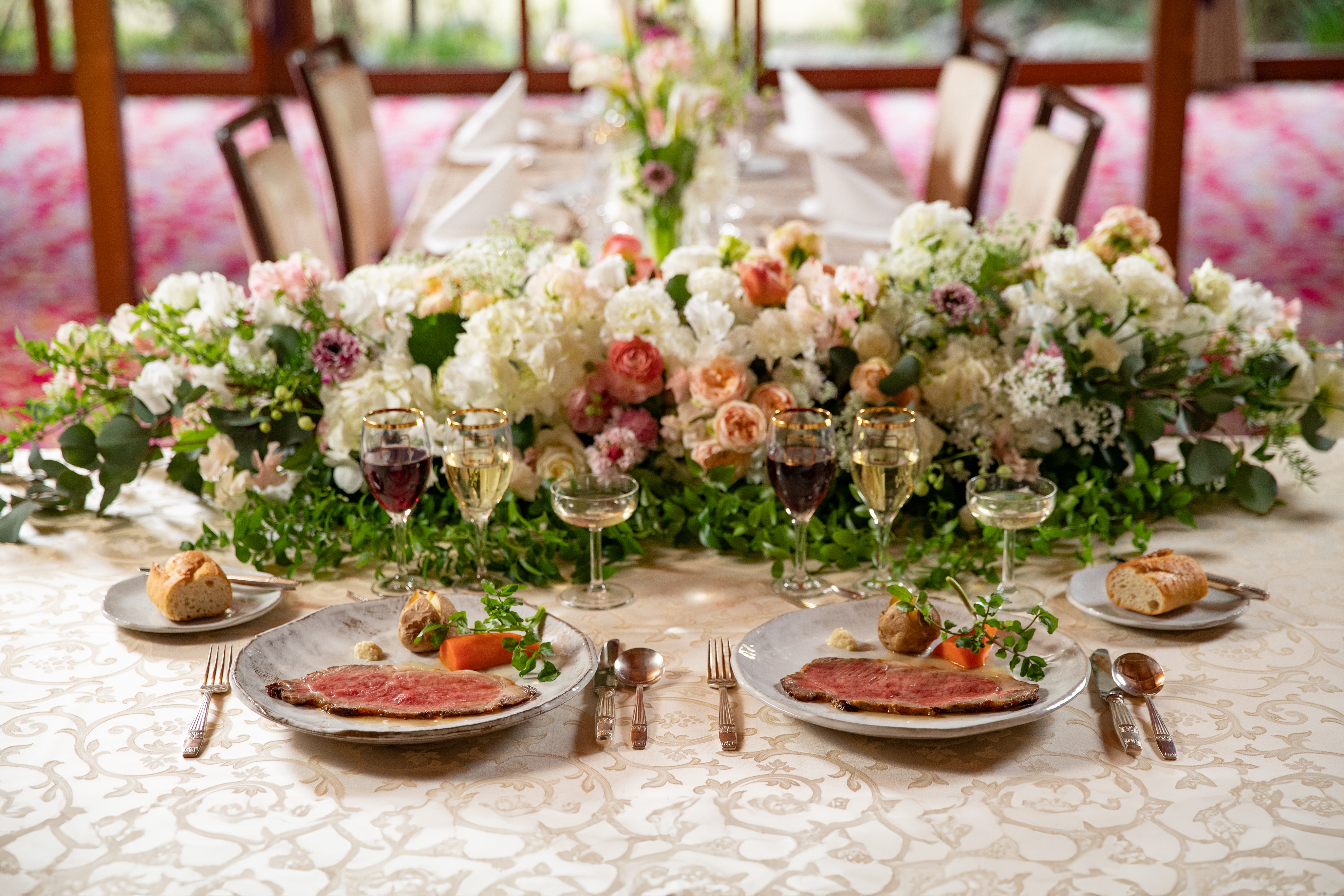 少人数の会食から披露宴、ガーデン挙式まで幅広く承り、ゲストの前で切り分けるローストビーフセレモニーが、祝福の一日を鮮やかに彩ります。